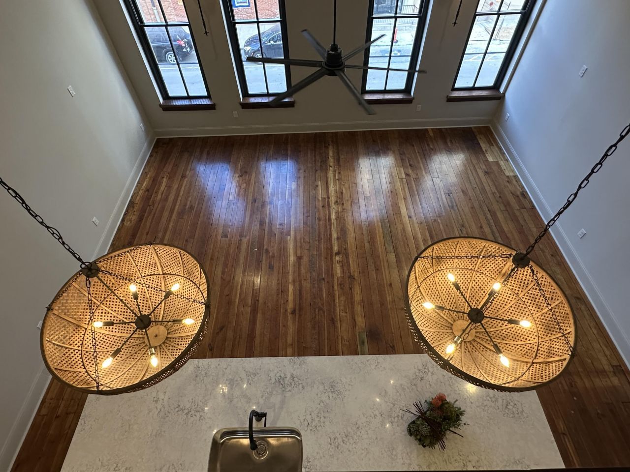 The Loft is a stunning two-bedroom, two-bath luxury apartment located in the heart of Downtown Frankfort. This one-of-a-kind residence blends historic architecture with modern design and features an expansive open living space with a large livable loft overlooking the main level. The main living area showcases soaring ceilings, exposed wood beams, dramatic arched windows overlooking downtown, and beautifully restored hardwood floors. Natural light pours through the tall windows, creating an open and inviting space that highlights the historic character of the building. The chef's kitchen is the centerpiece of the home, featuring custom cabinetry, stainless steel appliances, quartz countertops, and an oversized island that provides ample space for cooking, dining, and entertaining. Upstairs, the large loft area offers flexible living space that can be used as a home office, lounge area, media room, or additional sleeping area. The open railing and exposed beam structure give the loft a unique architectural feel while maintaining connection to the main living space below. Both bedrooms are spacious and well-appointed, and the two full bathrooms feature modern tile work, custom vanities, and contemporary fixtures. A washer and dryer are included in the unit for added convenience. Tenants are responsible for electricity and water. A one-year lease is required. A $35 application fee is required per adult applicant, along with a $25 administrative fee due at move-in. No smoking is permitted inside the units.